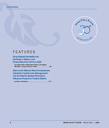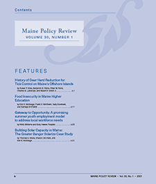 Maine Policy Review publishes timely, independent, peer-reviewed analysis of public policy issues relevant to the state of Maine. The journal is published two times per year by the Margaret Chase Smith Policy Center at the University of Maine and the Margaret Chase Smith Foudation. It is intended for a diverse audience, including state policymakers; government, business, and nonprofit leaders; students; and general readers with a broad interest in public policy.